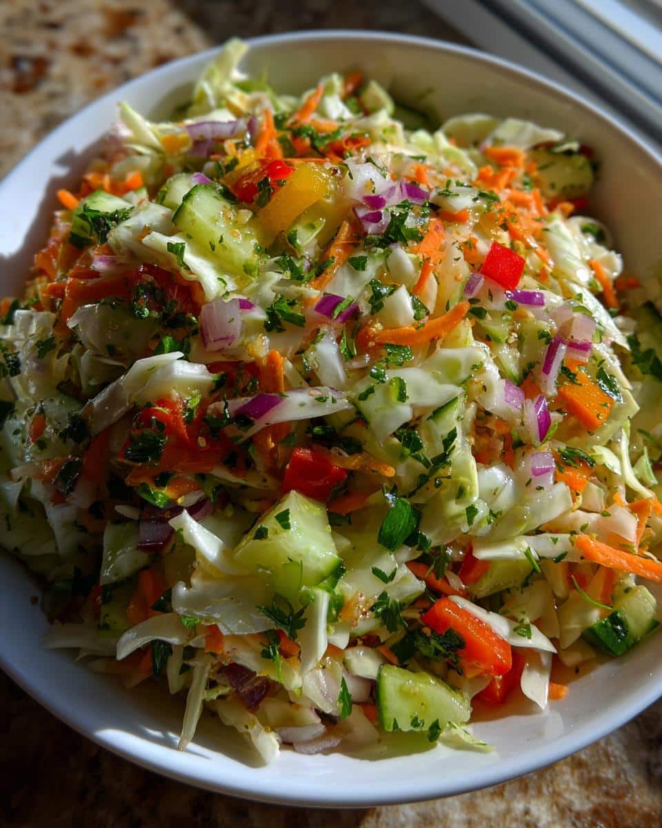 First, grab a large mixing bowl and toss in your shredded cabbage, grated carrot, diced cucumber, diced bell pepper, thinly sliced red onion, and chopped parsley. Just look at all those colors—so inviting!